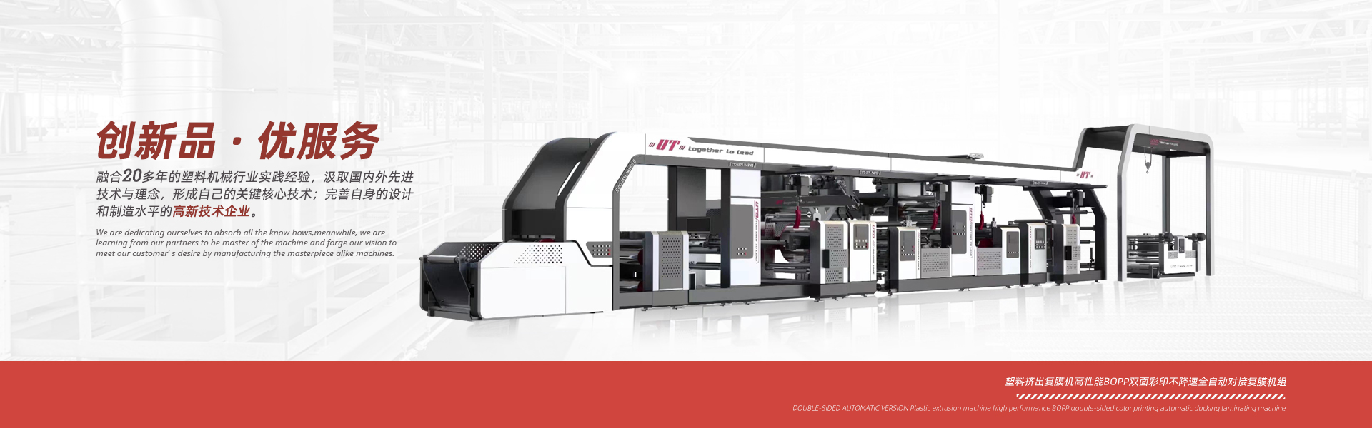 優(yōu)特機械精心致力于塑料編織行業(yè)、紙塑軟包裝行業(yè)、輪胎制造行業(yè)等成套生產設備的設計和制造,并為用戶提供生產工藝及培訓。我們的服務范圍包括各類塑料覆膜機、紙張覆膜機、BOPP彩印膜雙面自動對版覆膜機、 紙塑邊縫三合一覆膜機、中縫印刷制袋機、以及輪胎行業(yè)循環(huán)回收使用的隔離膜生產線。